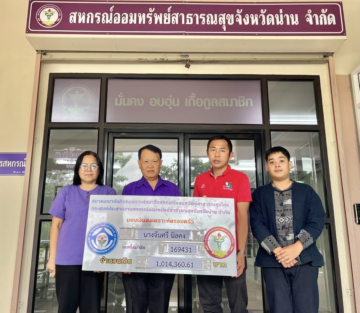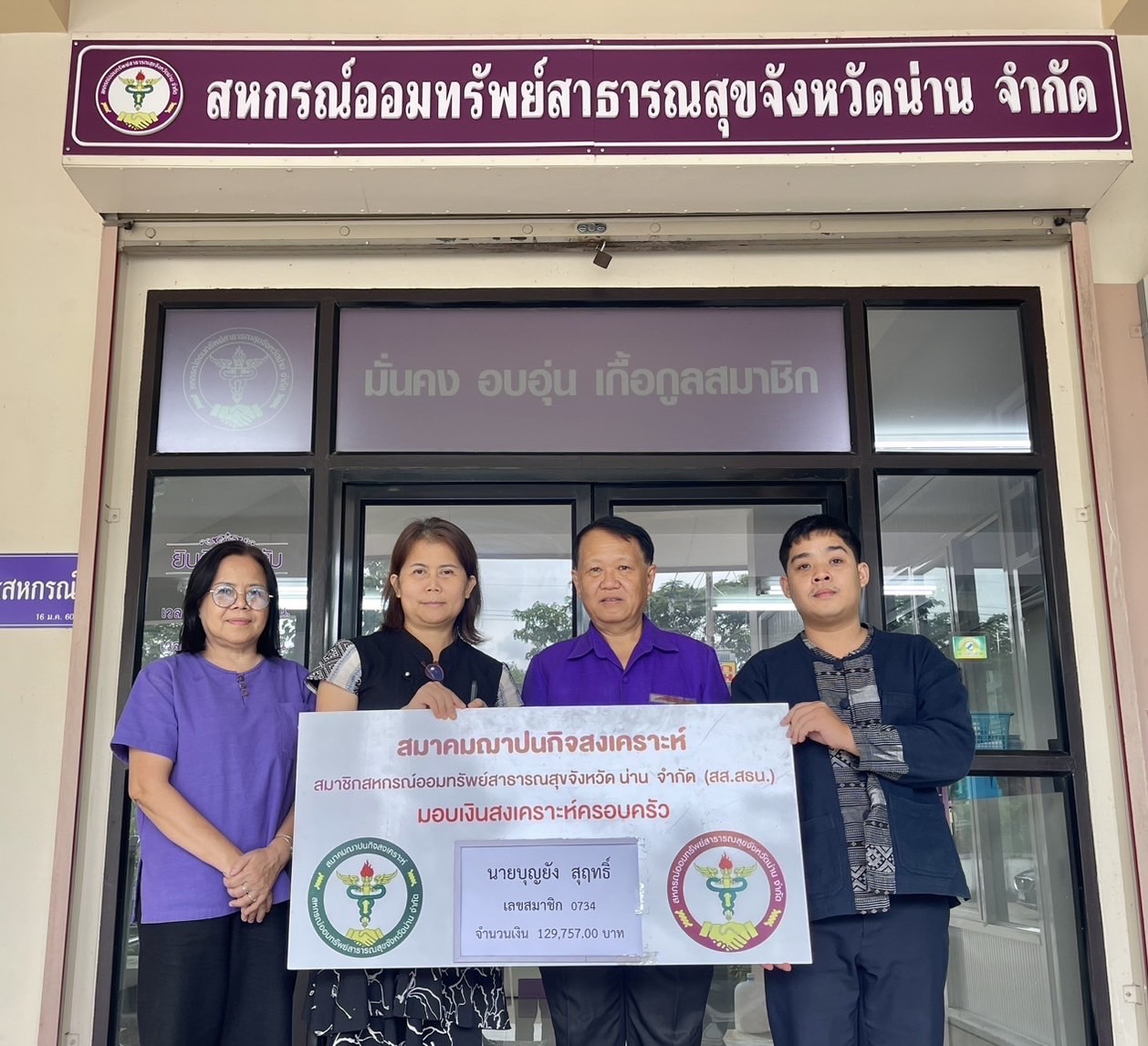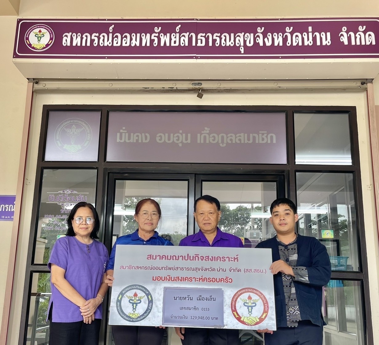 วันที่ 22 สิงหาคม 2568 สมาคมฌาปนกิจสงเคราะห์สมาชิกสหกรณ์ออมทรัพย์สาธารณสุขไทย (สสธท.) และ สมาคมฌาปนกิจสงเคราะห์สหกรณ์ออมทรัพย์สาธารณสุขจังหวัดน่าน จำกัด (สส.สธน.) ได้อนุมัติเงินสงเคราะห์ครอบครัวให้แก่ทายาทผู้เสียชีวิต จำนวน 3 ราย โดยมีนายชุมพล สุทธิ ประธานกรรมการฯ, นางมะลิวัลย์ พานิชอิน รองผู้จัดการฯ เป็นตัวแทนมอบเงินสงเคราะห์ให้แก่ทายาทผู้เสียชีวิต